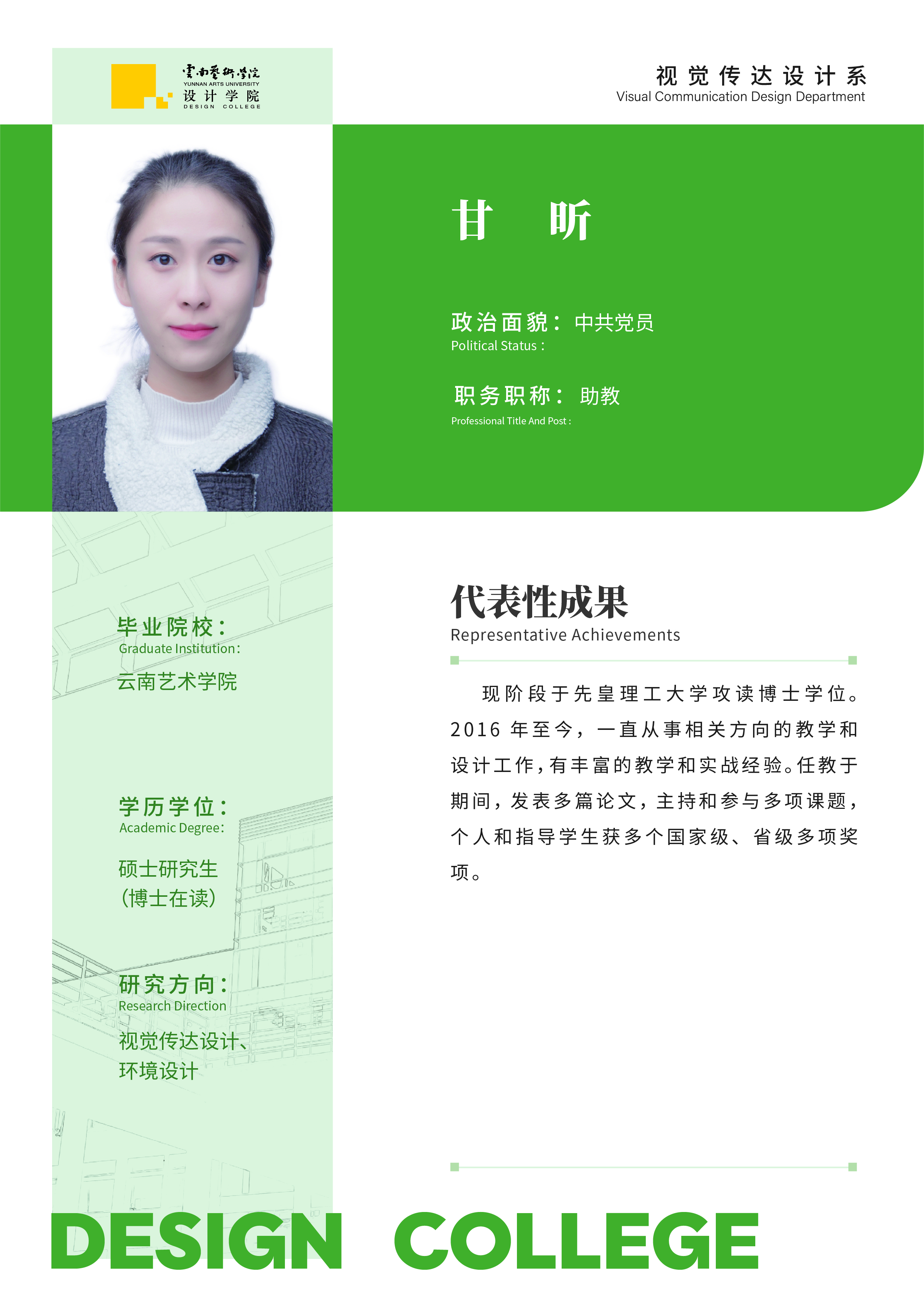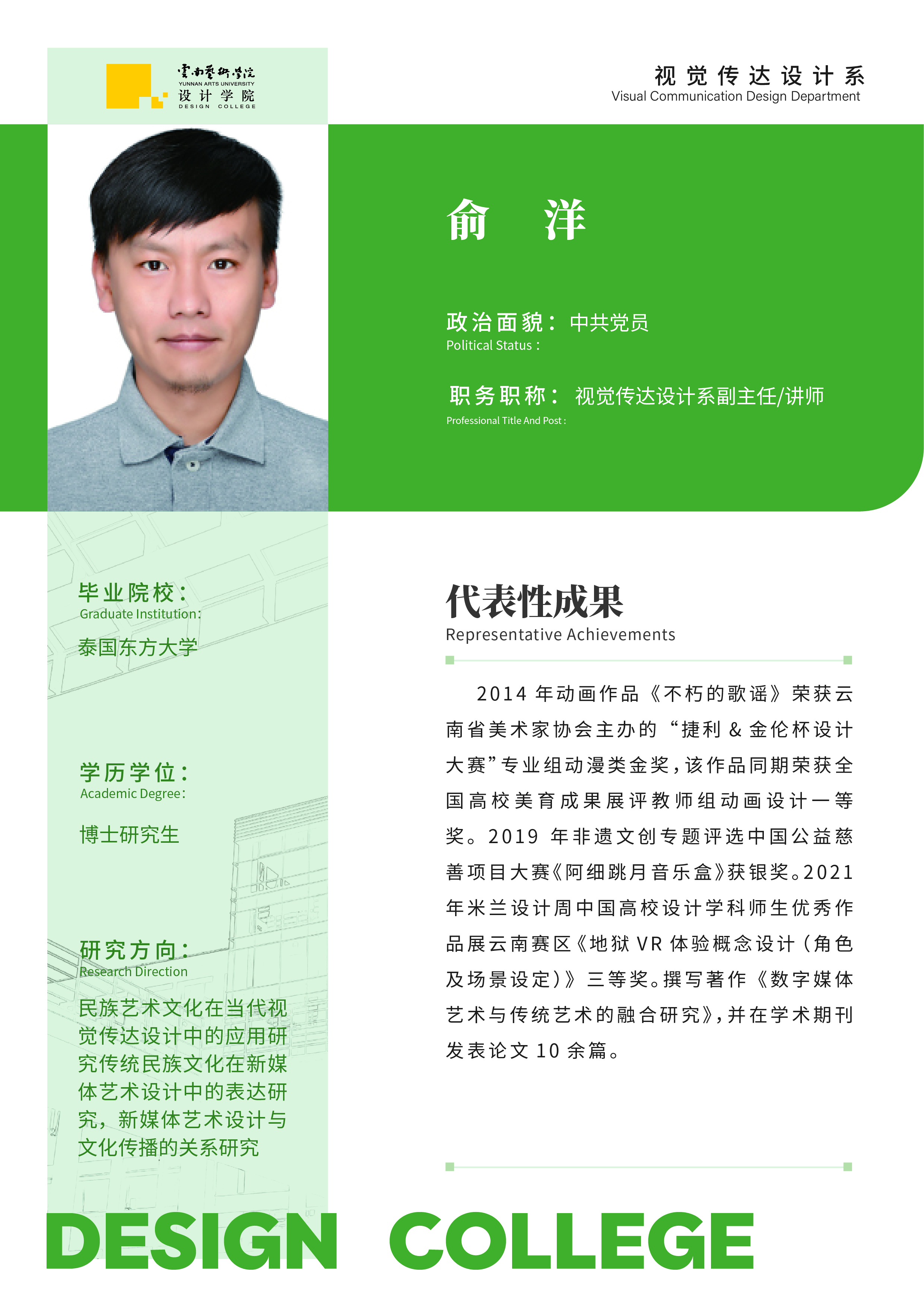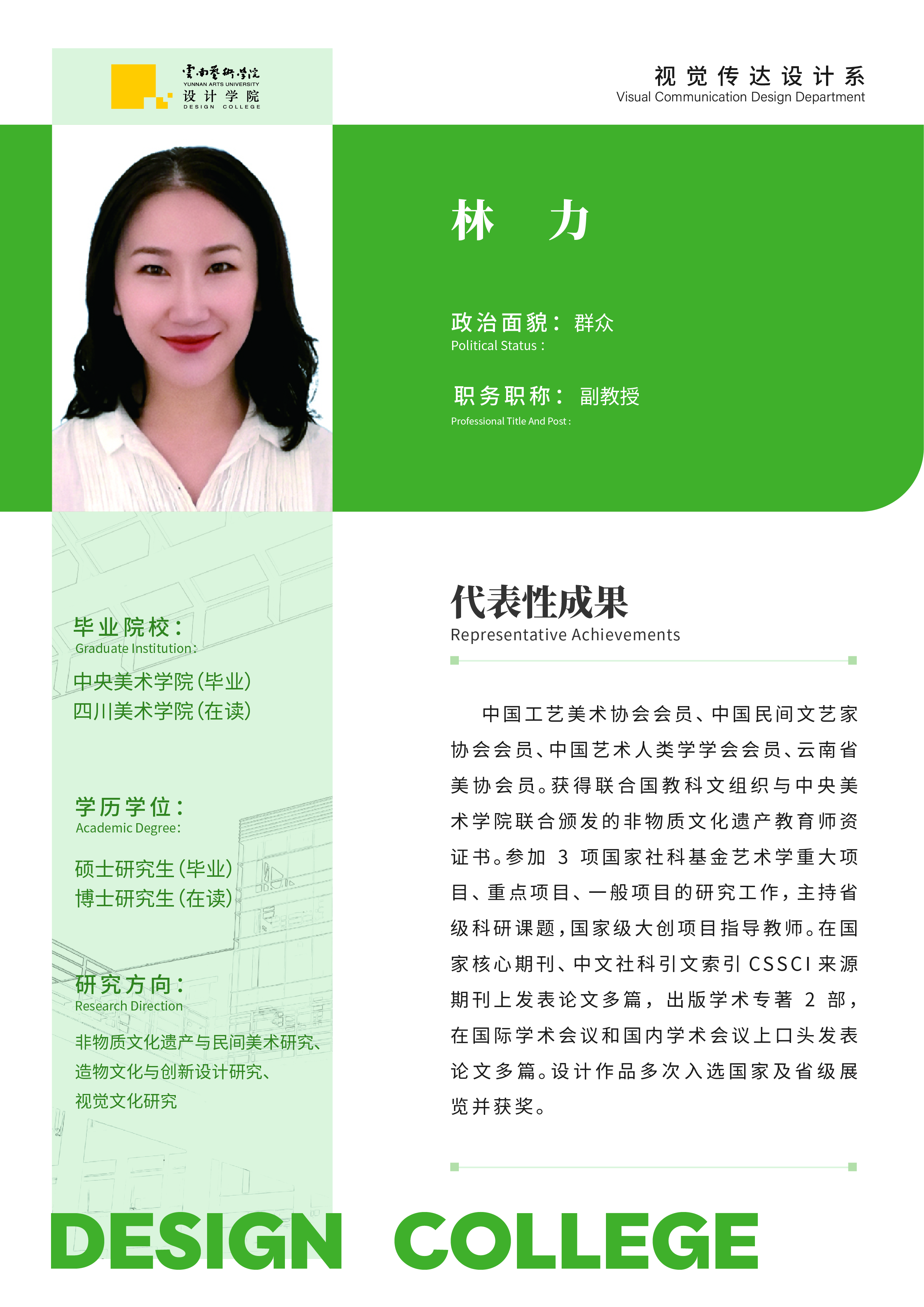 在科研方面,视觉传达设计专业取得了丰硕的成果。系部教师担任教育部课程思政示范课团队成员;教育部高校原创文化精品推广行动计划负责人;省教育厅科技创新团队成员;省社科科普宣传周重点项目负责人;云南省高校黄大年式教师团队成员;省教学成果一等奖团队成员等。国家级项目2项,省社科项目立项2项,出版资助1项;省教育厅基金项目7项等;相关论文发表并获奖四十余篇,出版著作18部。专业设计作品荣获教育部、文化部、全国美展、国家新闻出版署、中国包装联合会、中国美术家协会、中国出版协会、中国高等教育学会等国家级专业赛事活动的入选、获奖六百余项。