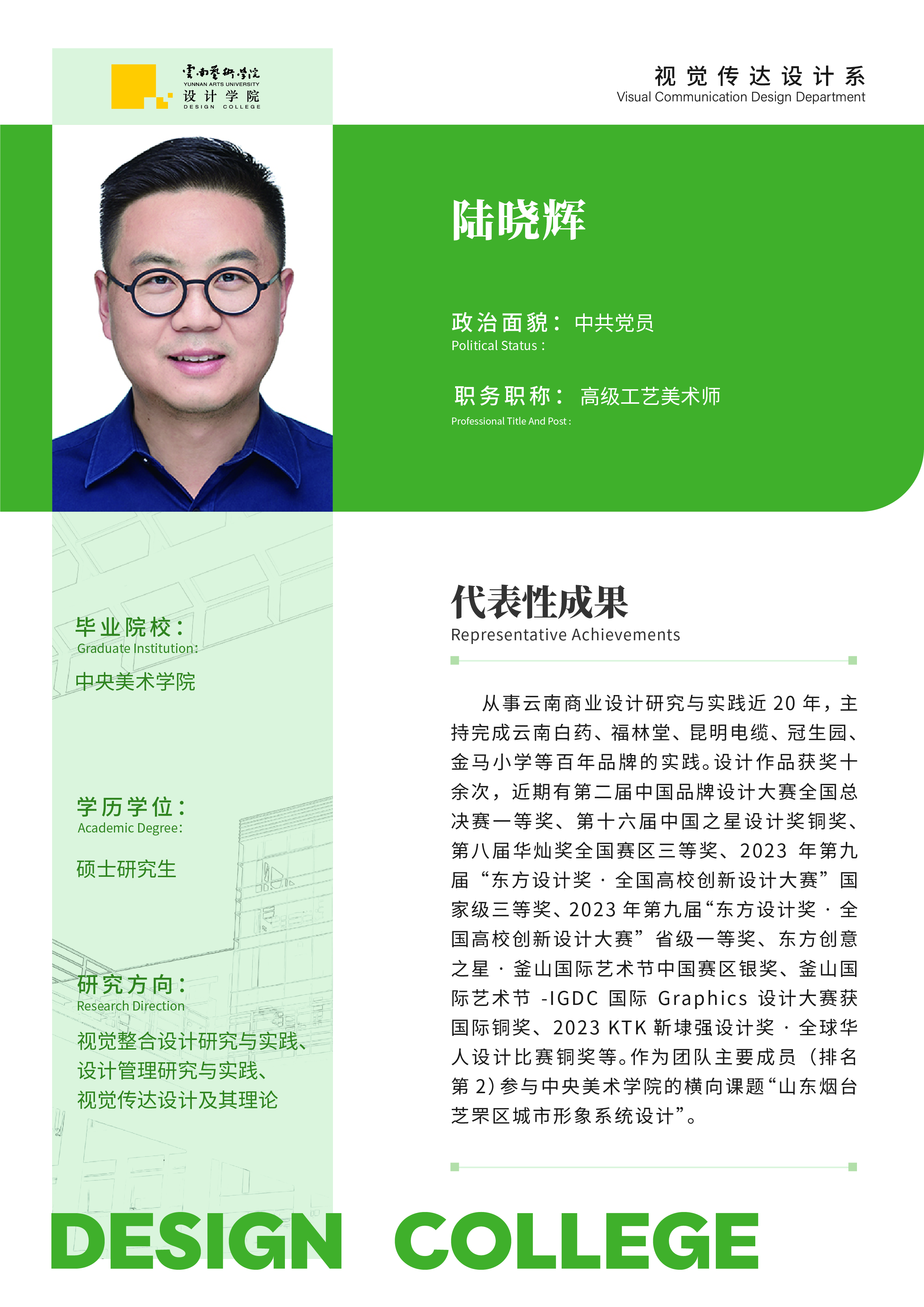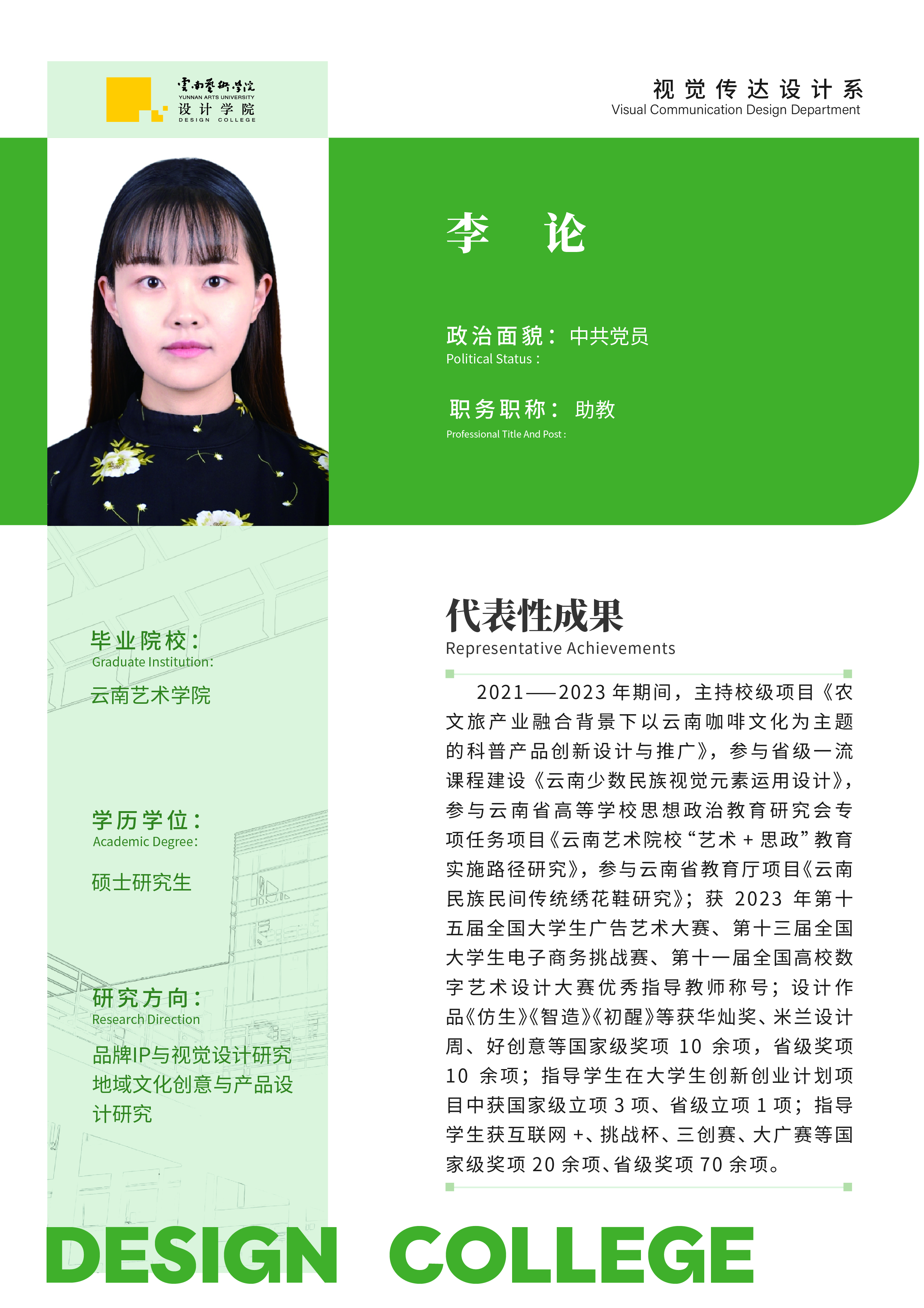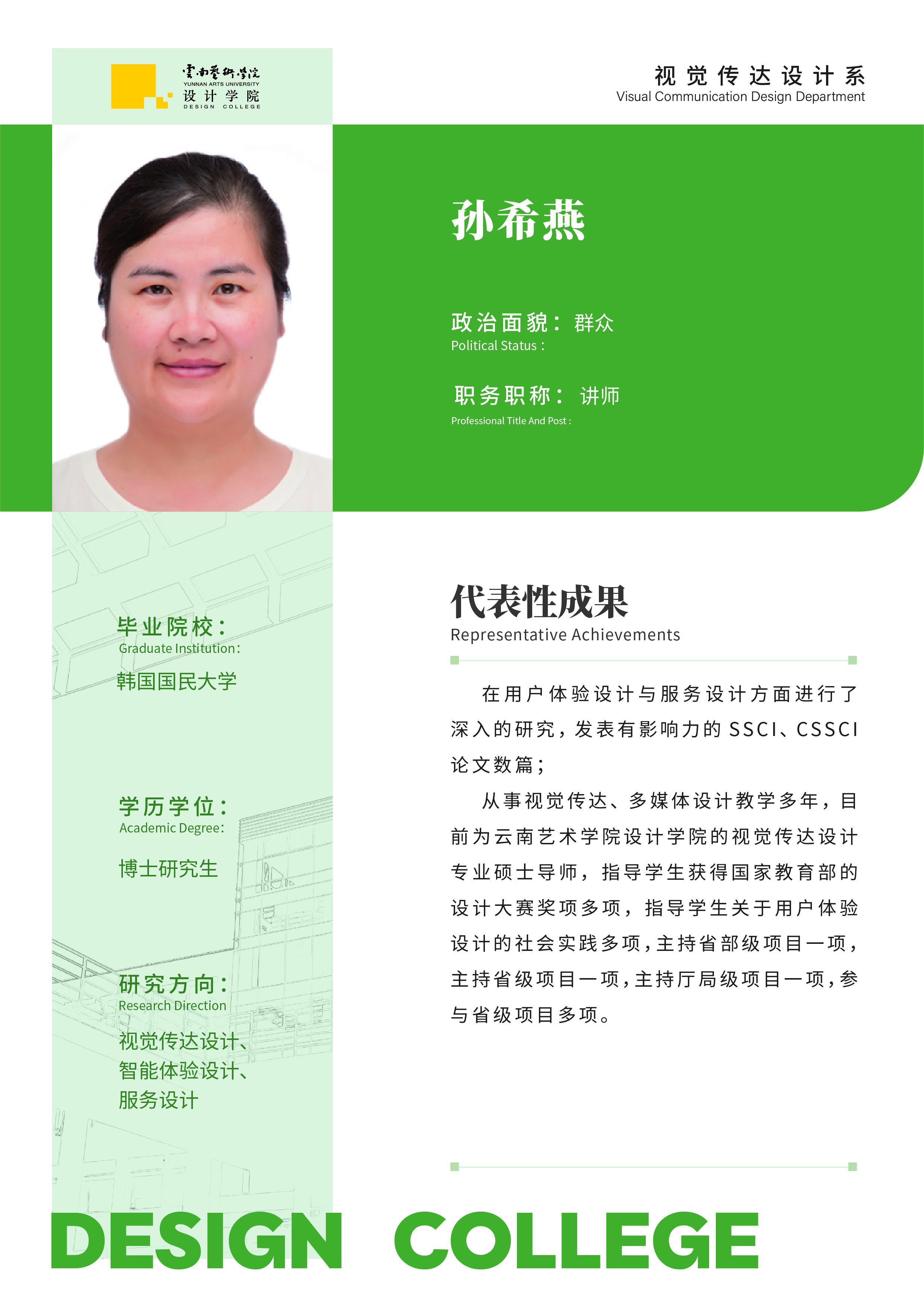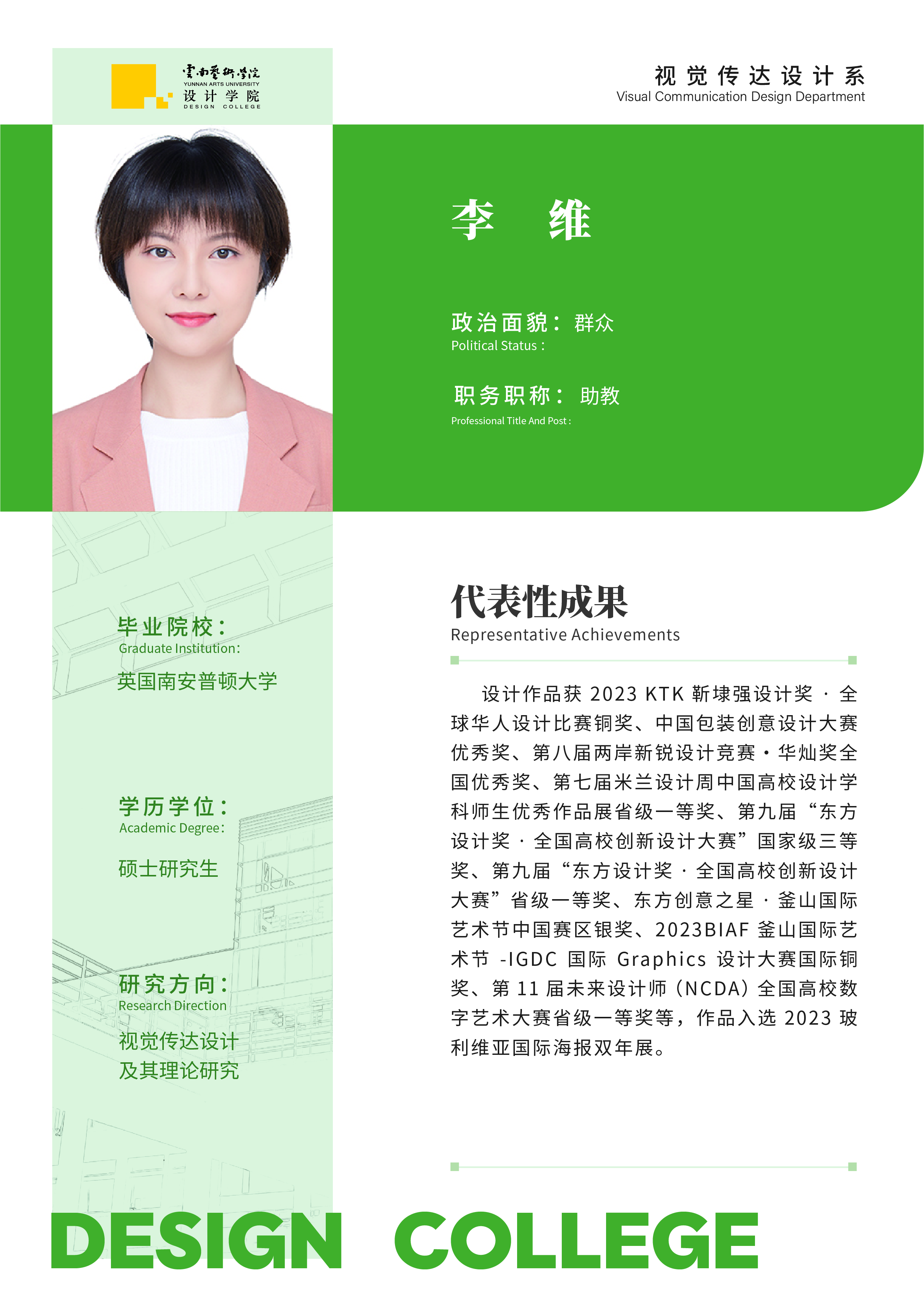 在专业发展方面,视觉传达设计专业紧跟社会经济发展和学科专业建设的步伐,紧扣国家和地方发展战略,聚焦专业、课程与项目的需求,从项目选题、设计过程、成果落地全过程体现思政教育引导和落实。关注生态保护,助力云品出滇,传播特色文化,校地校企互联。以云花、云茶、云咖、云果、云药等为代表的绿色食品品牌出滇计划和以“花茶果咖菌”五大地方绿色产业定位是专业设计教学与社会实践服务的目标方向。努力建设实践成效,推动设计服务走进生活,改善云南的人民生活体验与水平;同时主动融入国家发展战略,夯实专业在西南民族地区,尤其是特有民族族群的图样、符形、符号等领域的研究话语权,促进文化互通交流与文化安全,增强文化自信,推动铸牢中华民族共同体意识。