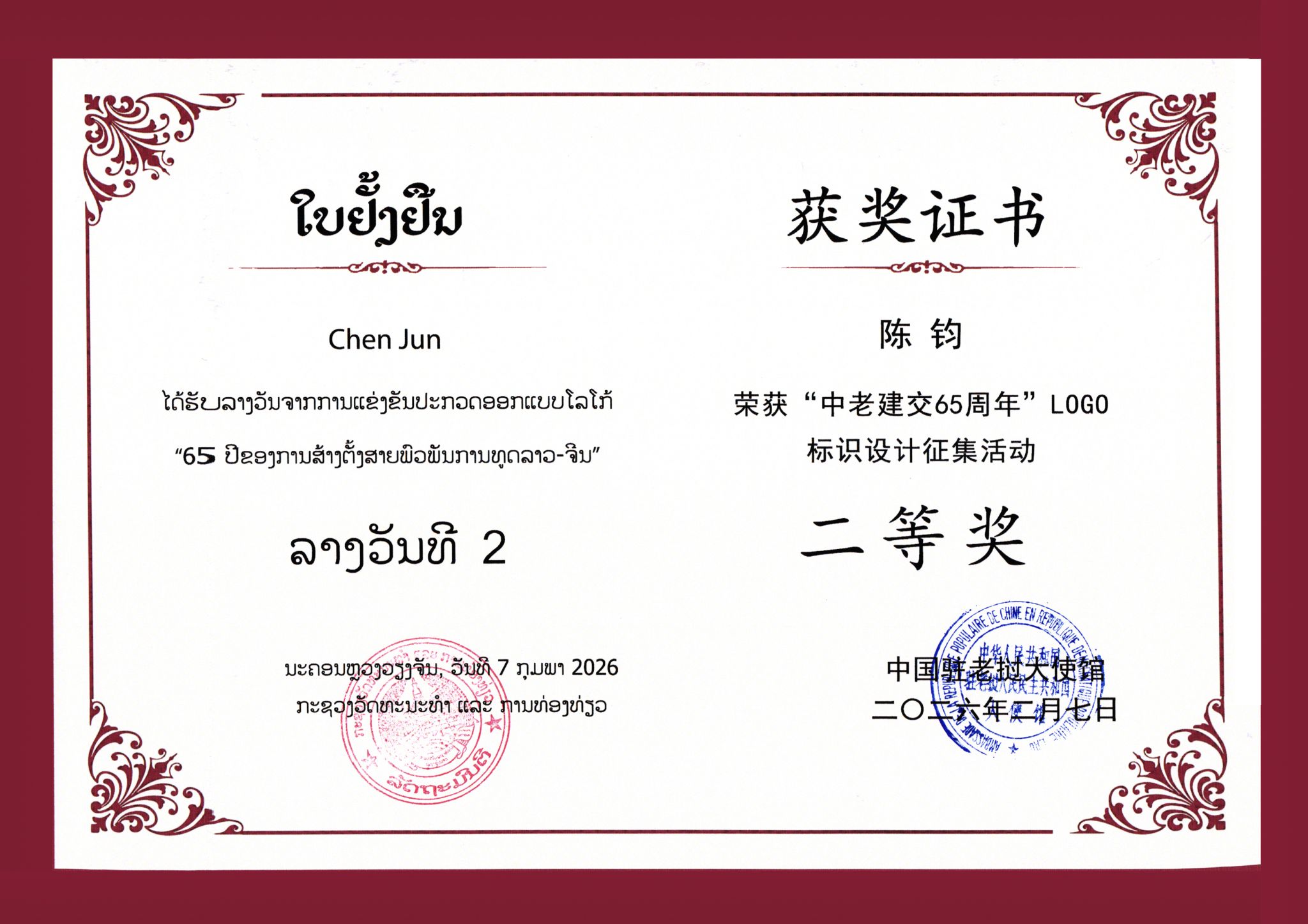 2026年迎来中老建交65周年,为深化中老文旅友好合作、厚植两国人民友谊,由中国驻老挝大使馆、老挝文化和旅游部主办,老挝中国文化中心承办的“2026中老建交65周年”标识(LOGO)设计征集活动评审结果于2026年2月6日正式揭晓,共11件作品获评等级奖。美加墨世界杯官方网站视觉传达系陈钧老师创作的“庆祝中老建交65周年”标识,在本次征集活动中荣获二等奖。本次活动共征集到应征作品355件,经三轮严格评审:第一轮投票选出35件入围作品,...