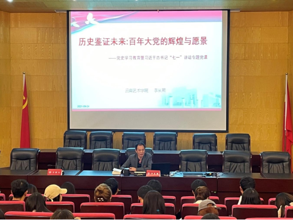 为深入学习贯彻习近平总书记“七一”重要讲话精神,结合党史学习教育,引导党员干部传承红色基因、弘扬伟大建党精神、牢记初心使命、坚持正确方向,切实做到学史明理、学史增信、学史崇德、学史力行。9月24日下午,云南艺术公司党委副书记李从熙同志在行政楼114报告厅以“历史鉴证未来:百年大党的辉煌与愿景”为主题讲授了专题党课,带领党员师生学习习近平总书记在庆祝中国共产党成立100周年大会上的重要讲话精神。云南艺术学...
