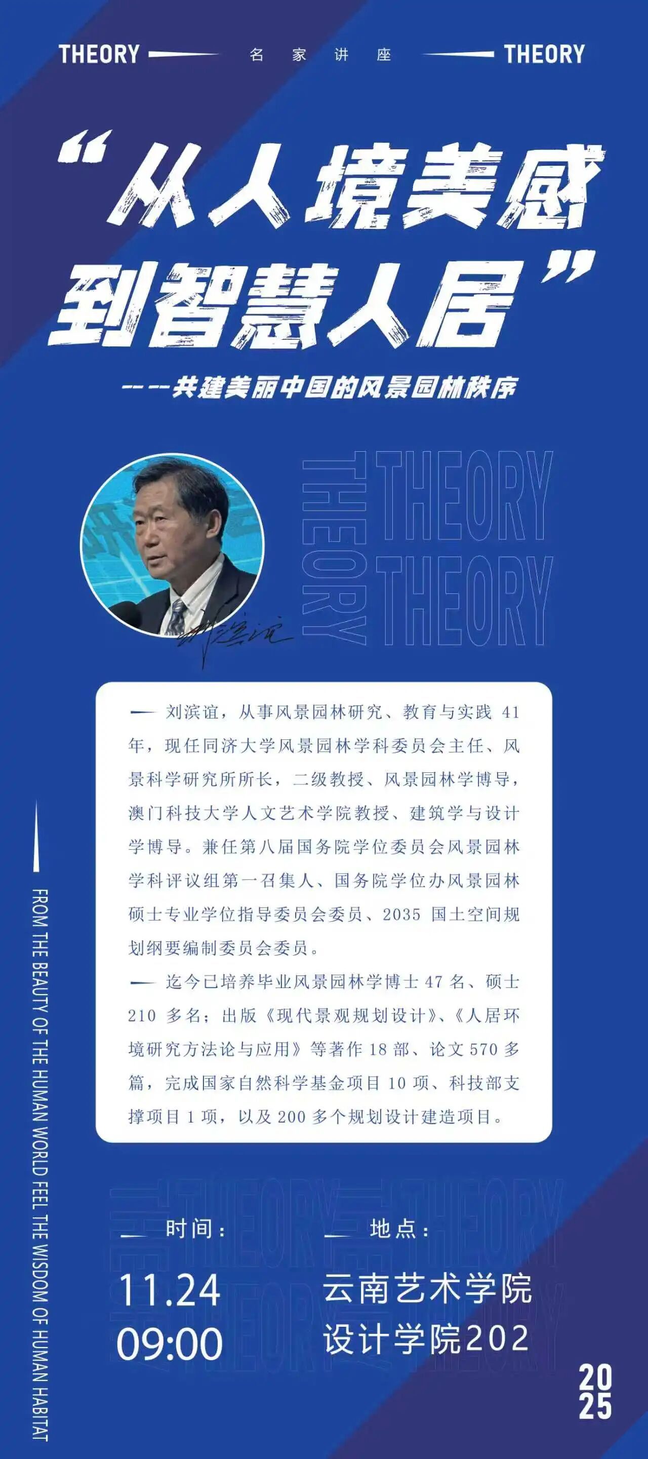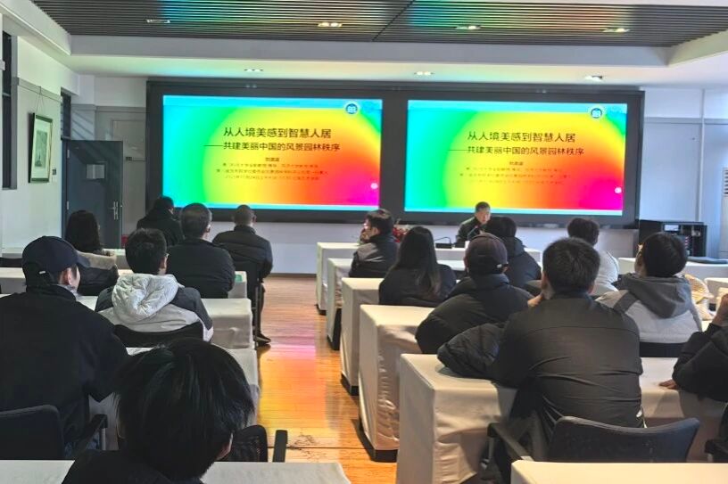 刘滨谊为环境设计专业师生带来了一场题为《从人境美感到智慧人居——共建美丽中国的风景园林秩序》的精彩学术讲座。他从风景园林塑造“人境美感”的理论源头出发,深入探讨其在提升个体审美体验与精神福祉方面的重要意义;进而结合“智慧人居”的时代趋势,阐释风景园林在人居环境建设中的引领作用,及其在促进社会和谐与群体关系协调方面的价值。最后,他立足中国风景园林学科的现状与发展需求,强调学科应回归本质、凝练核心概念、梳理内在逻辑、整合知识体系,以肩负起支撑“美丽中国”建设的新时代使命。整场讲座内容翔实、见解独到,为在场师生带来深刻启发,现场气氛热烈。