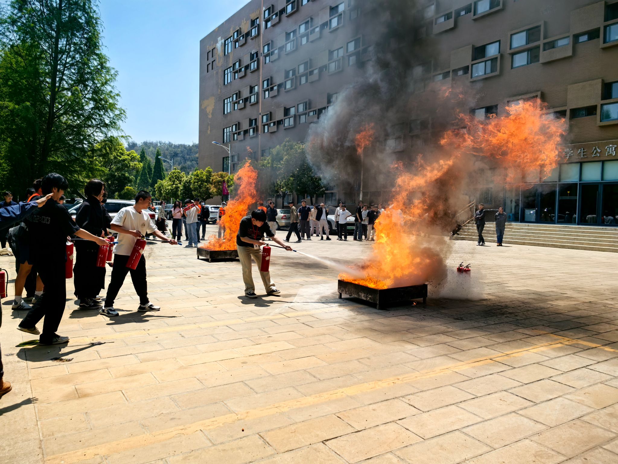 消防设施和器材的灭火实操在五栋男生宿舍楼下空地进行,参加实操演练的师生代表在保卫处消防工作人员的指导下,按照消防器材讲解与示范要求,进行灭火器材操作技能实作演练。