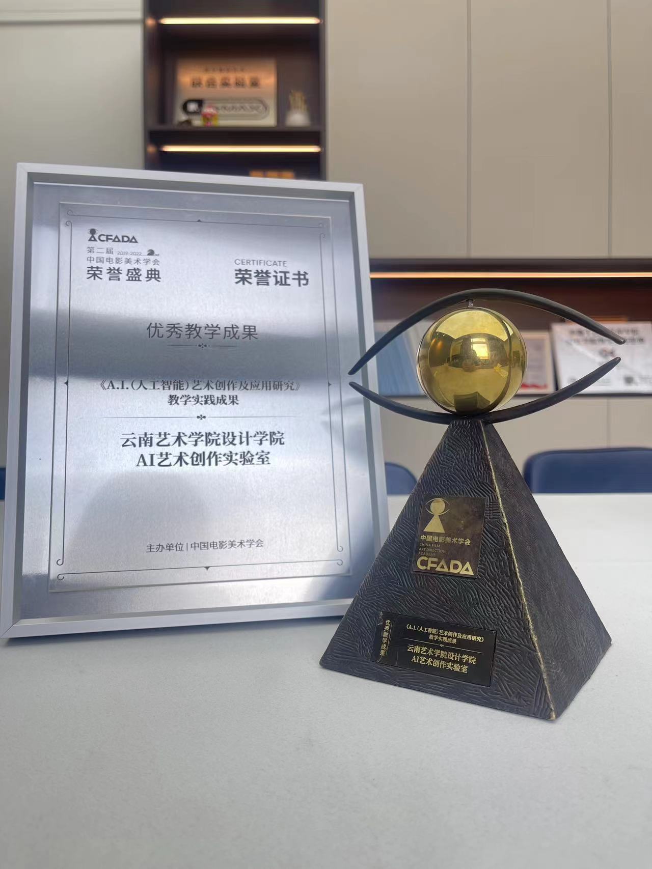 2023年,美加墨世界杯官方网站A.I.艺术创作实验室的《A.I.(人工智能)艺术创作及应用研究》教学实践成果获第二届中国电影美术学会优秀教学成果奖。