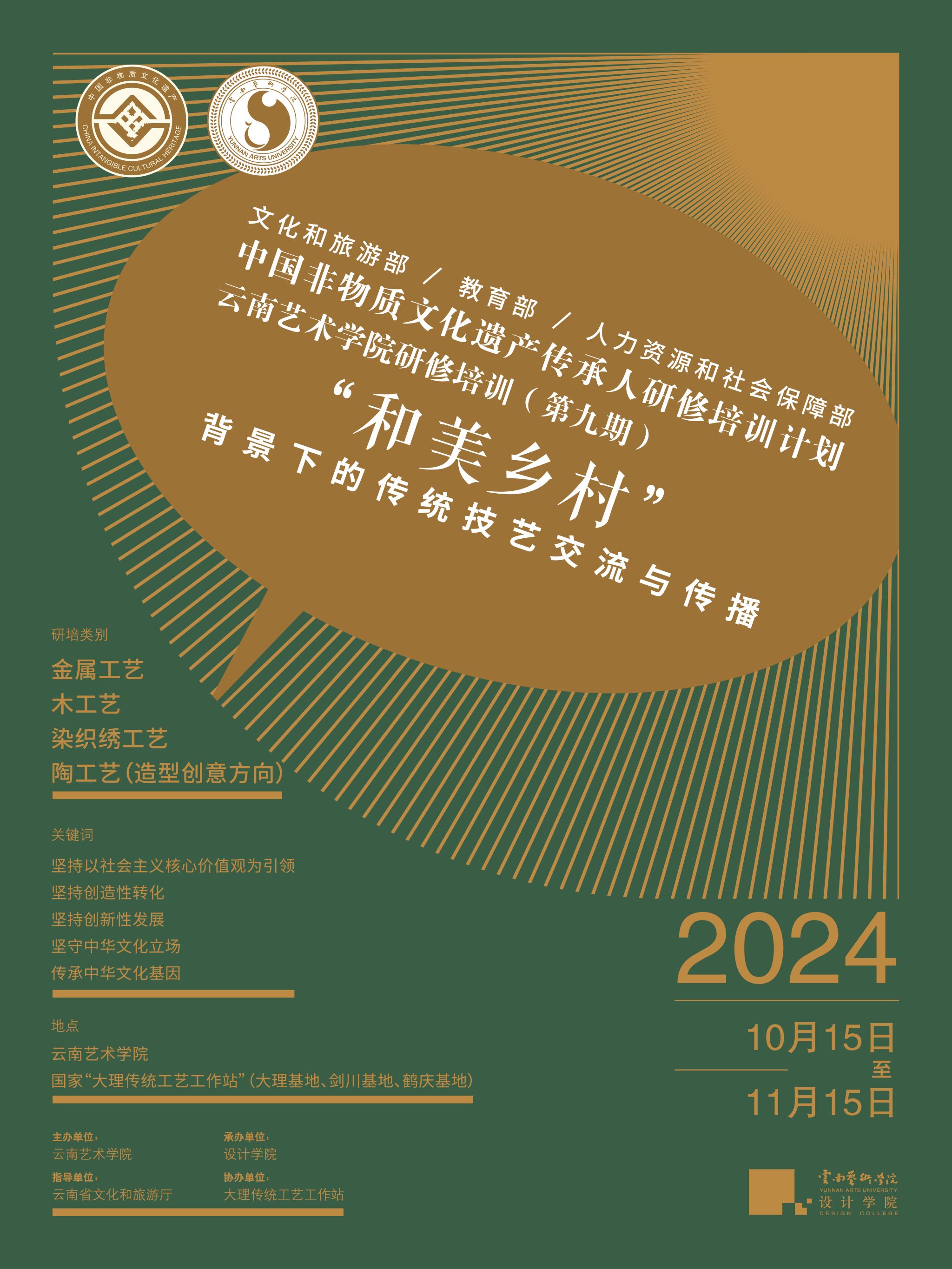 经文化和旅游部批准,美加墨世界杯官网在云南省文化和旅游厅的指导下,定于2024年10月15日——2024年11月15日举办“和美乡村”背景下的传统技艺交流与传播研修班(第9期),现向各地招收学员,具体通知如下: