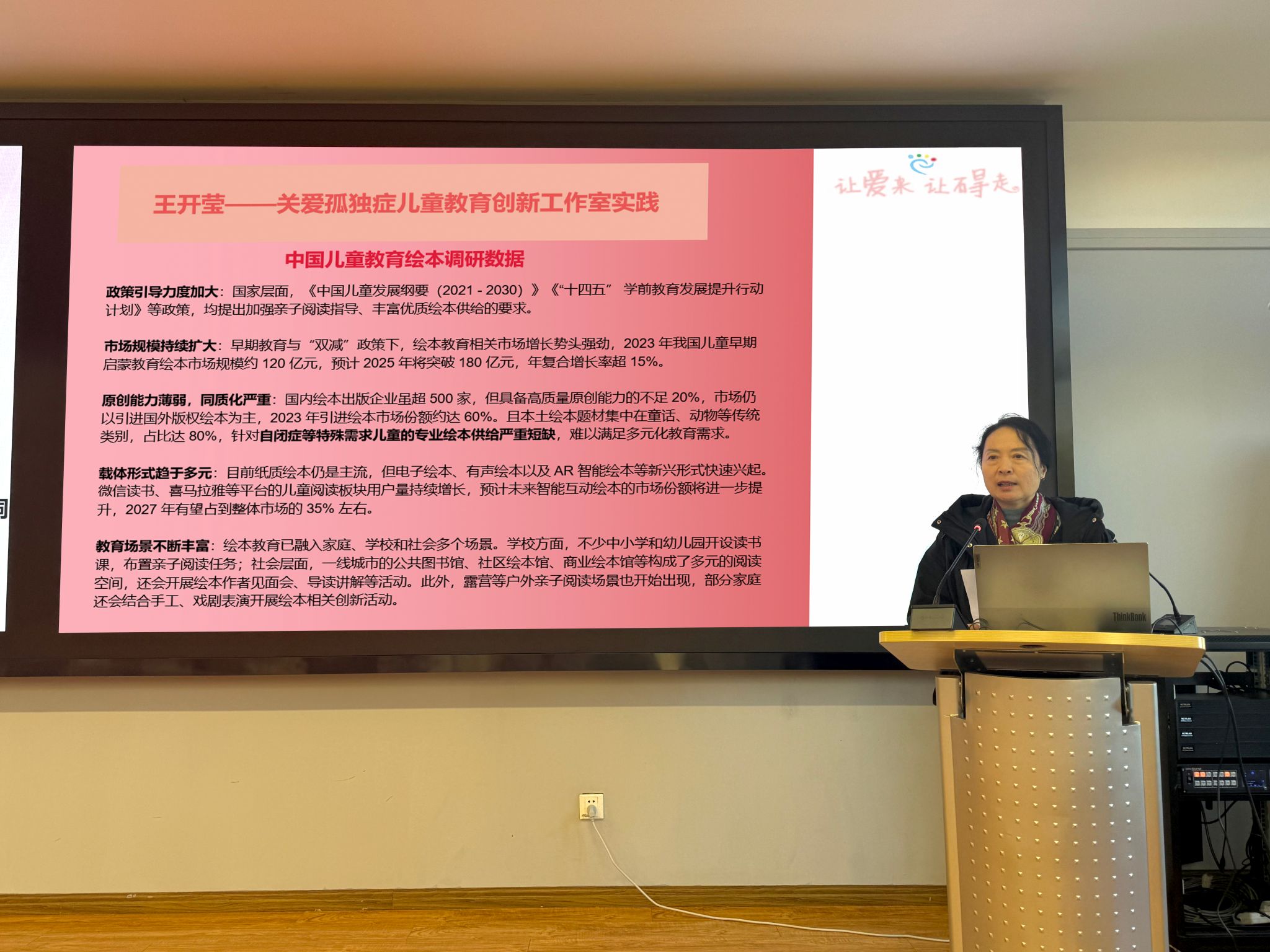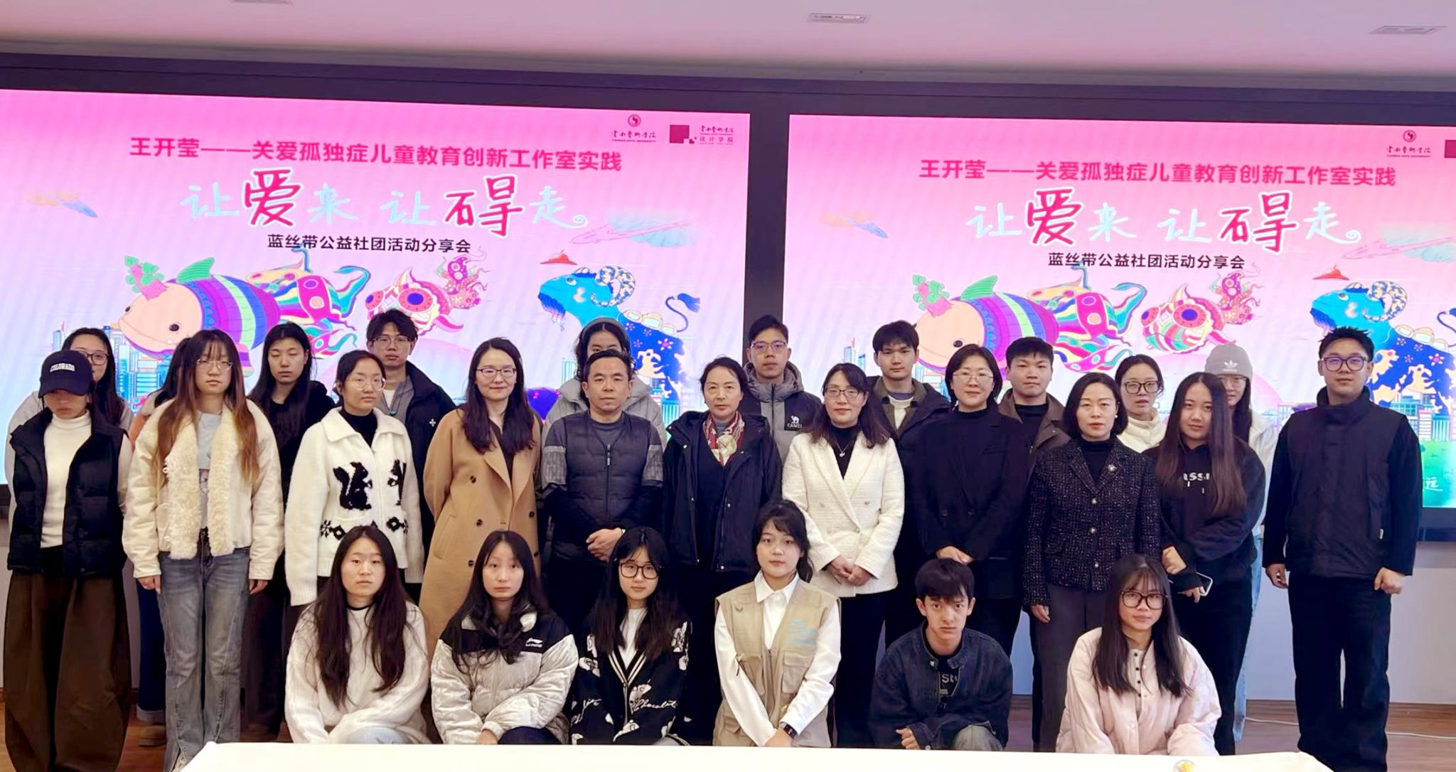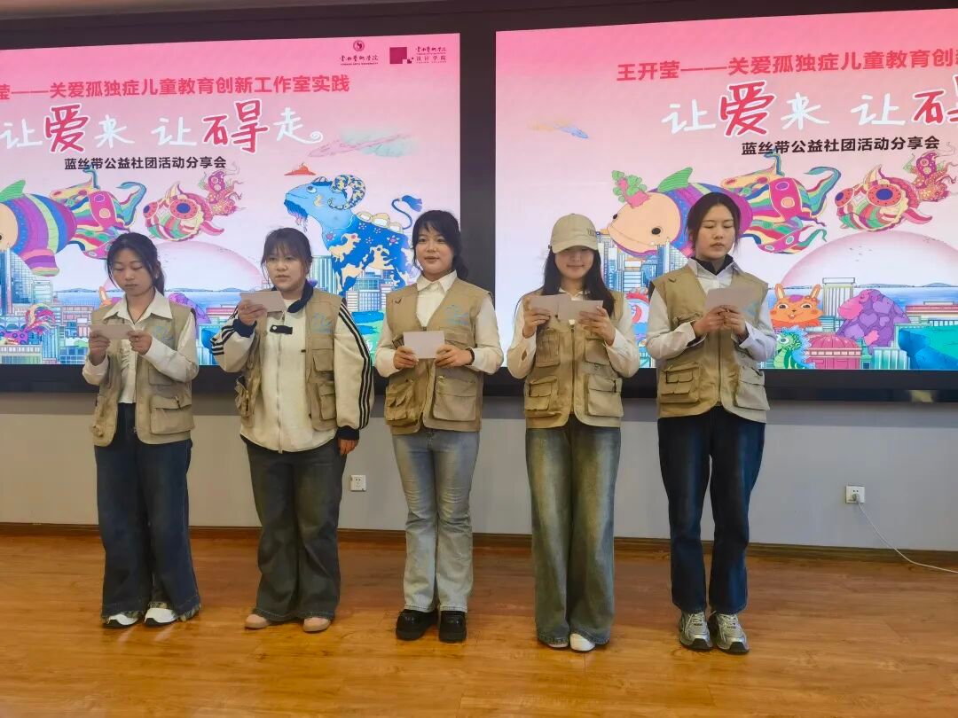 最后,创新工作室、蓝丝带公益社团创始人王开莹老师分享了多年来深耕孤独症儿童帮扶领域的经历。她介绍,工作室始终贯穿“让爱来·让碍走”的公益理念,未来将开展孤独症儿童艺术疗愈课程研发、公益文创设计等项目,继续发挥设计学科优势,为孤独症儿童打造更具针对性的帮扶方案,提供更为专业的技术支撑,呼吁更多人来关心关爱孤独症群体。正如蓝丝带所象征的意义:包容与关爱终将汇聚成暖流,让每一个独特的生命都能在阳光下绽放。