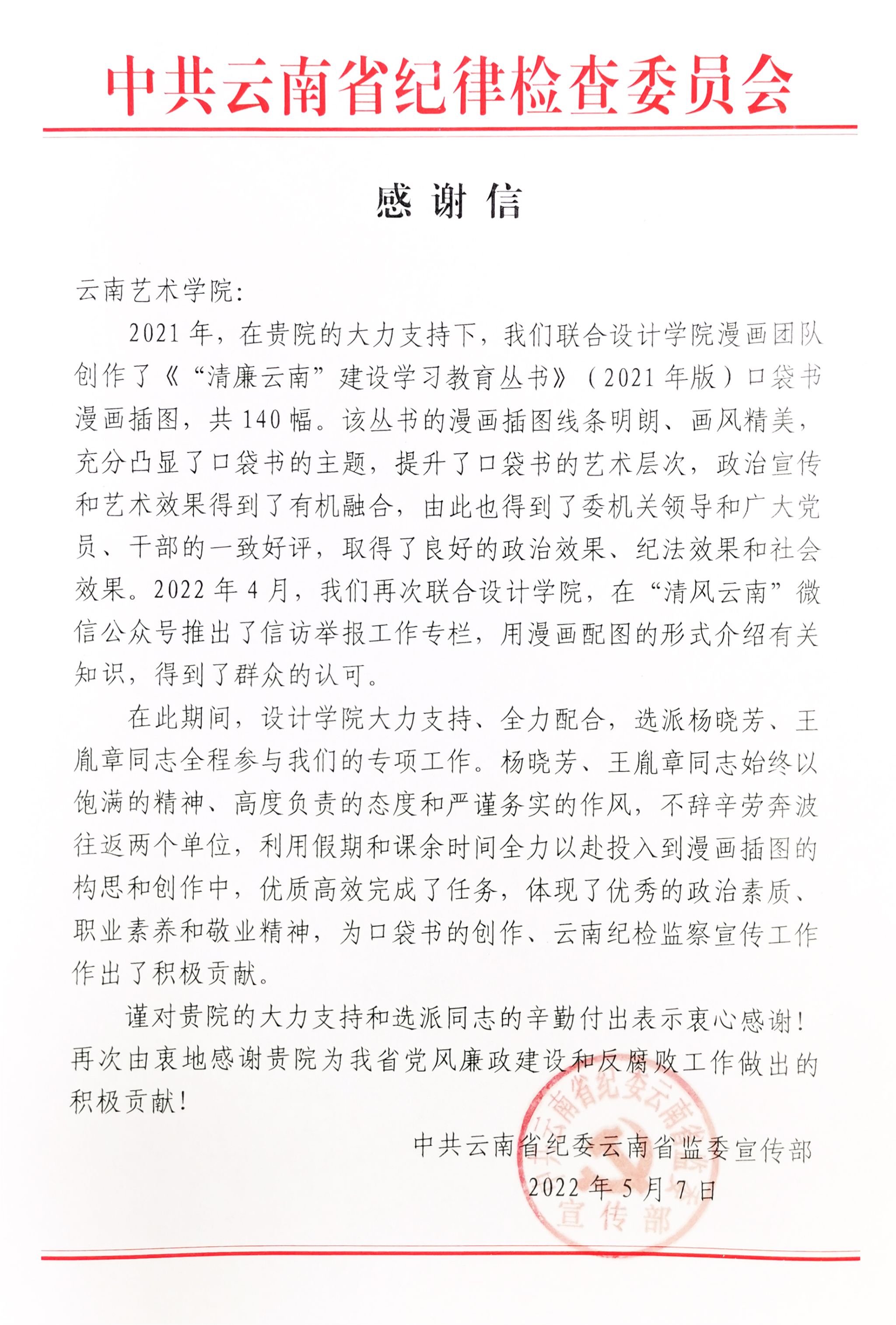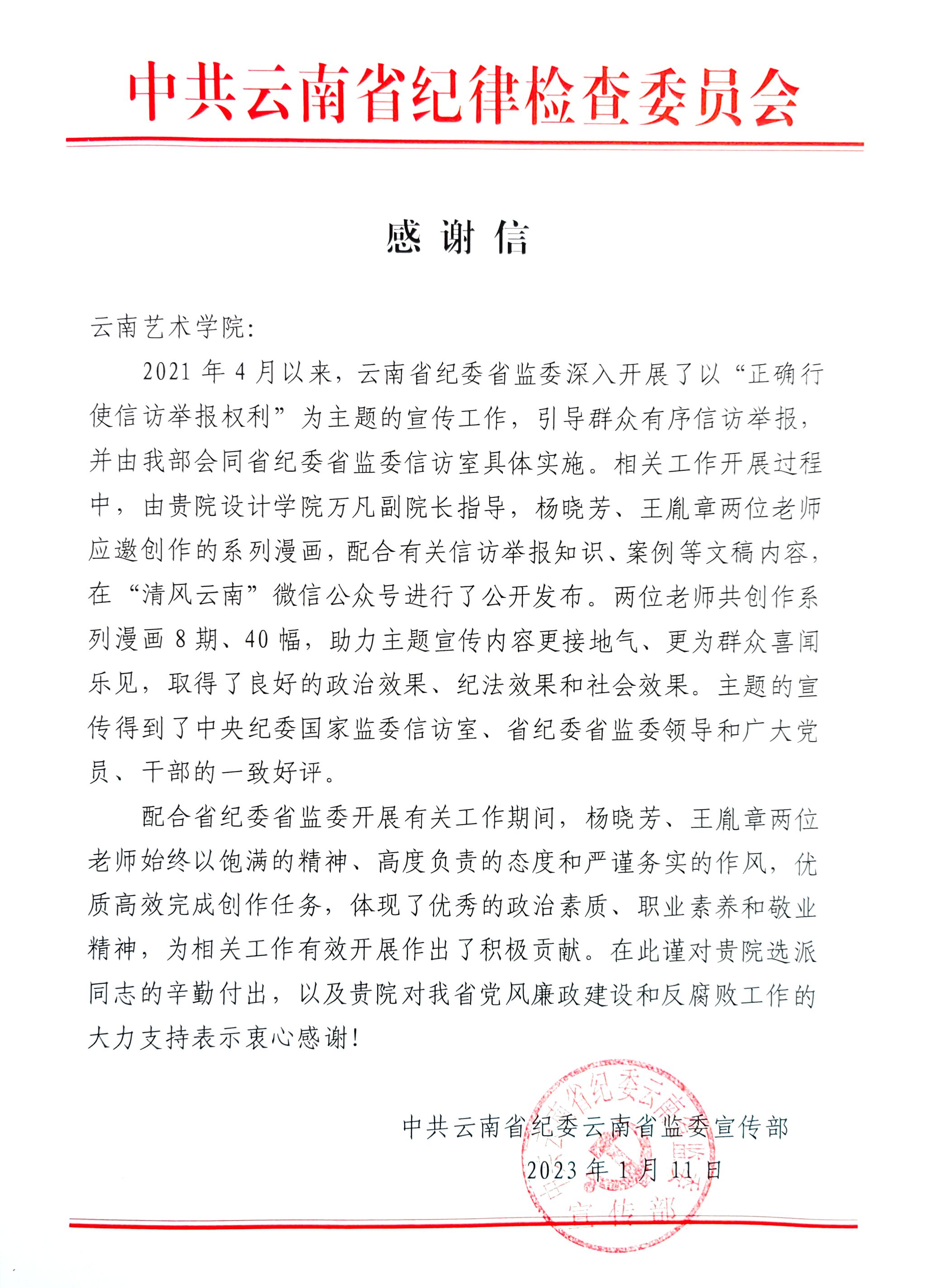 自2021年4月起,美加墨世界杯官方网站持续助力中共云南省纪律检查委员会、云南省监察委员会《“清廉云南”建设学习教育丛书》《正确行使信访举报权利》等法治主题宣传项目的漫画创作工作。此项工作的核心目标是通过创意漫画这一通俗易懂的艺术形式,结合吸引眼球的漫画标题,将复杂的廉政教育内容转化为易于理解和引人入胜的视觉故事,旨在有效提升党员及公众的廉政意识,促进廉洁文化的深入人心。美加墨世界杯官方网站漫画创作团队通过漫画的视觉艺术形式助力了法治主题宣传教育更接地气、更为群众喜闻乐见,取得了良好的政治效果、纪法效果和社会效果。不仅得到了云南各地机关、社区、公司、企业及医院等广泛学习与报道,还赢得了中央纪委国家监委信访室、省纪委省监委领导以及广大党员干部的高度赞誉,彰显了其在推动法治廉政教育方面的显著成效。中共云南省纪律检查委员会特此发来两封感谢信,对美加墨世界杯官方网站的鼎力支持表示衷心的感谢与崇高的敬意,进一步肯定了美加墨世界杯官方网站在法治廉政文化建设中所作出的积极贡献。