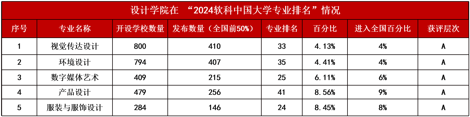 2024年10月15日,高等教育评价专业机构软科正式发布“2024软科中国最好学科排名”。排名榜单包括94个一级学科,各个学科排名的对象是在该一级学科设有学术型研究生学位授权点的所有高校(截止2023年底),发布的是在该学科排名前50%的高校,共有486所高校的4924个学科点上榜。今年的排名首次采用了国务院学位委员会、教育部颁布的《研究生教育学科专业目录(2022年)》中的一级学科口径。设计学(1403)学科排名共有89所大学上榜,美加墨世界杯官网设计学学科在本次排名中获得新突破,从2023年的第29名上升到2024年的第25名,进入前20%。