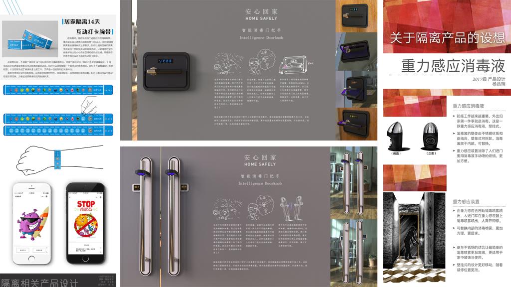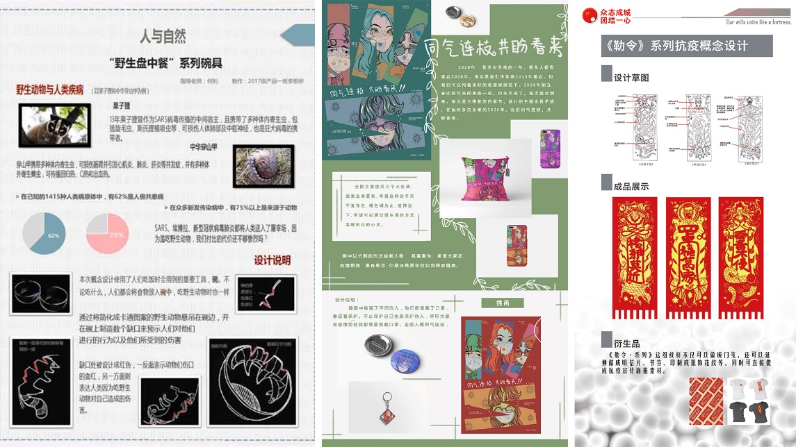 面对疫情,产品设计专业通过视频课程(直播与录播结合)、微信一对一指导、课后习作PPT云端投屏汇报三种主要形式推进理论与专业课程的教学工作。其间,云端实践创作课组织完成了“设计抗疫”主题创作活动。(如下图)