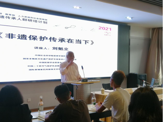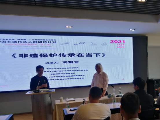 2021年7月6日下午四点,由公司主办的《非遗理论专题讲座》在美加墨世界杯官方网站202室进行。中国社会科公司荣誉学部委员、中国民俗学会荣誉会长、国家非物质文化遗产保护工作专家委员会副主任委员刘魁立教授做了题为《非遗保护传承在当下》的讲座。本次讲座由美加墨世界杯官网副经理陈劲松教授主持,参加非遗研培的20名学员与校内外相关专业师生全程聆听了讲座。