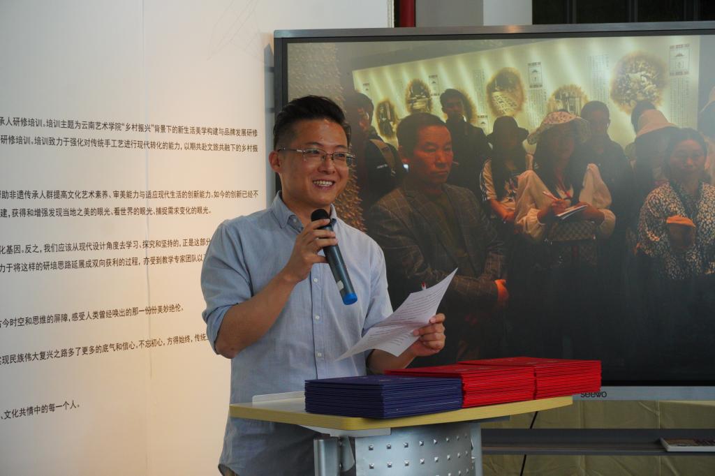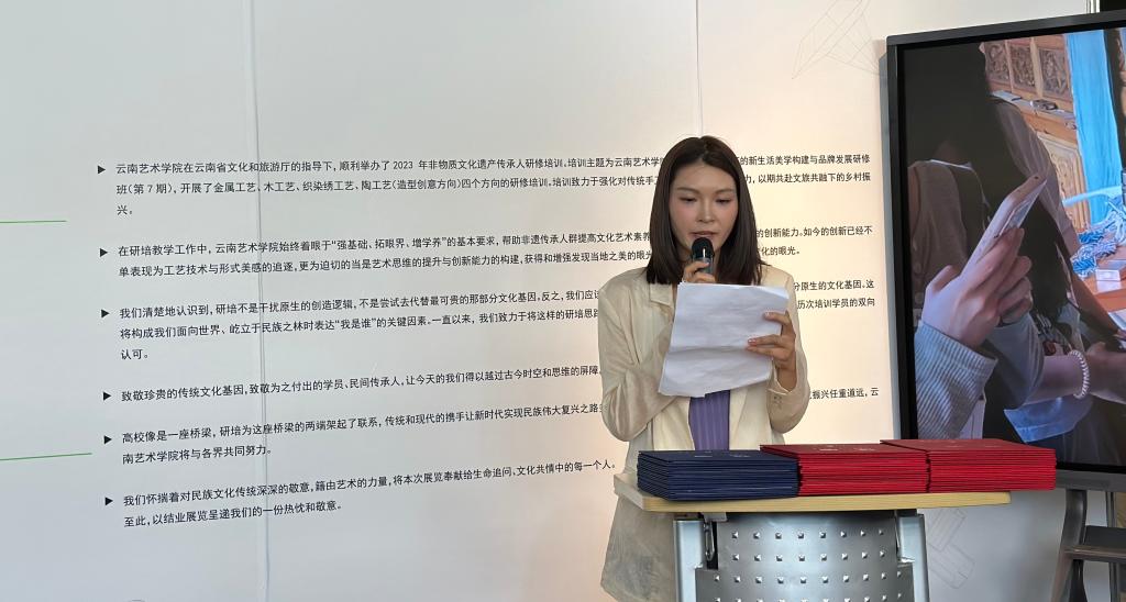 此次非遗研培学员代表发表了自己的培训感想,赖维然、何利军和张航3位学员依次发言,他们以真切的个人感受、富含激情的话语将培训过程中点点滴滴的心路历程向与会人员作了分享,现场不时传来阵阵鼓励与赞赏的掌声。