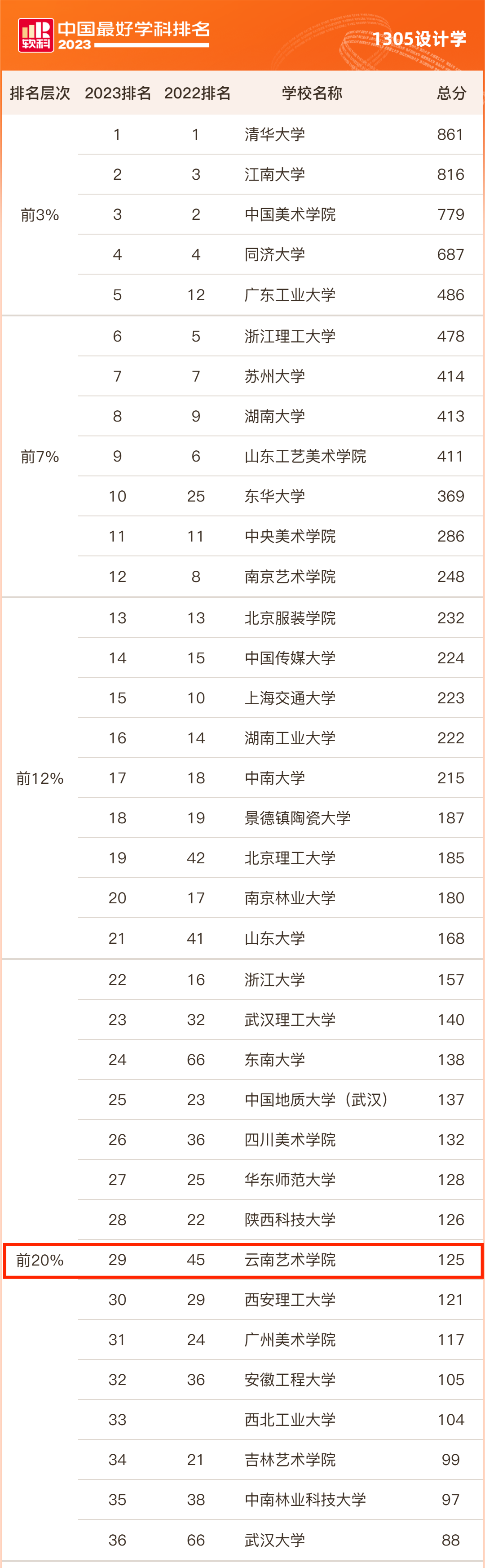 2023年11月8日,高等教育评价专业机构软科正式发布“2023软科中国最好学科排名”。排名榜单包括98个一级学科,各个学科排名的对象是在该一级学科设有学术型研究生学位授权点的所有高校,发布的是在该学科排名前50%的高校,共有485所高校的5053个学科点上榜。设计学学科排名共有87所大学上榜,美加墨世界杯官网设计学学科在本次排名中获得新突破,从2022年的第45名上升到2023年的第29名,进入前20%。