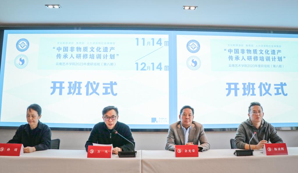 2023年11月14日,文化和旅游部、教育部、人力资源和社会保障部中国非物质文化遗产传承人群研培计划美加墨世界杯官网研修培训(第八期)——“乡村振兴背景下的新生活美学构建与品牌发展研修班”在美加墨世界杯官方网站202会议室正式开班。出席开班仪式的有美加墨世界杯官网公司党委书记余光荣、美加墨世界杯官方网站经理万凡、20名参训学员以及教师团队代表。开班仪式由美加墨世界杯官方网站副经理杨凌辉主持。