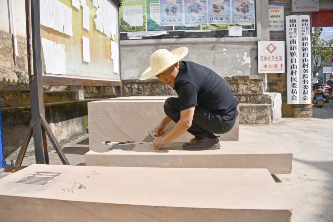 中午时分,巍山县南诏镇自由村委会大门外,41岁的龚栋强头戴草帽,手提錾子和小锤,蹲在一块红砂石的石条上,俨然一位地地道道的石匠。“坝头”两个字是他正在雕刻的内容,“上面是我设计的村名印章标志,接下来我还会在石条的中间位置雕刻书法和彝文村名,下面雕刻上自由村的简易地图。”
