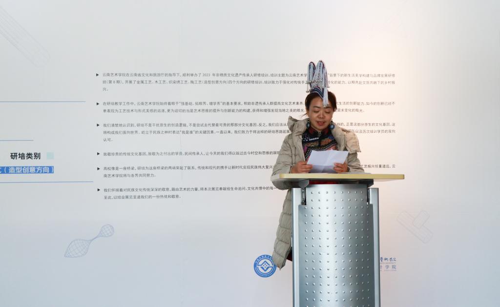 此次非遗研培学员代表尹丽、杨志瑞发表了自己的培训感想,她们以真切的个人感受、富含激情的话语将培训过程中点点滴滴的心路历程向与会人员作了分享,表示经过此次培训交流,不仅从专业的领域更加深刻具体地了解非遗的概念,也看到手工艺助推乡村振兴的能量,了解到时尚设计与乡土文化可以相互赋能,今后将更加坚定成为一名传承人的决心,现场不时传来阵阵鼓励与赞赏的掌声。