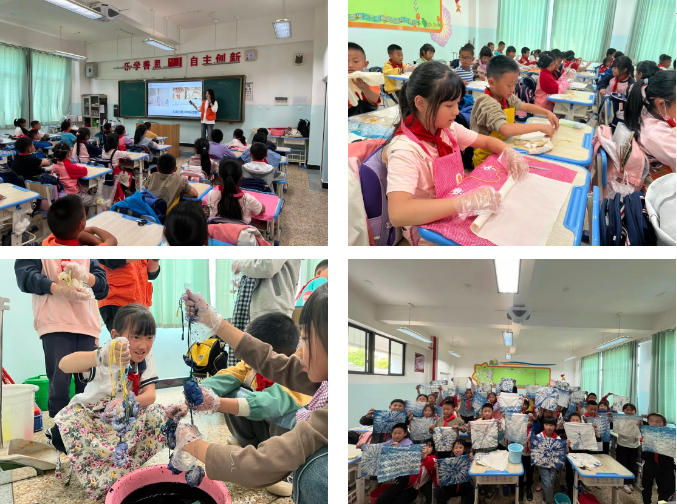 巧手扎锦绣,布里染斑斓。在志愿者老师们的帮助和指导下,同学们充分调动自己的艺术想象力,开始动手制作自己的扎染作品,将手中的白色麻布打绞成结后,用扎、缚、缀、夹等多种手法形成美妙的图案。这次非遗扎染之旅,让同学们体会到了动手的快乐和辛勤劳作的成就感。这是一次艺术与文化的碰撞,智慧与自然的融合,也是一次双手与材料的对话,更是一次传统与生活的共生共融,尽情感受非遗带来的魅力和乐趣。